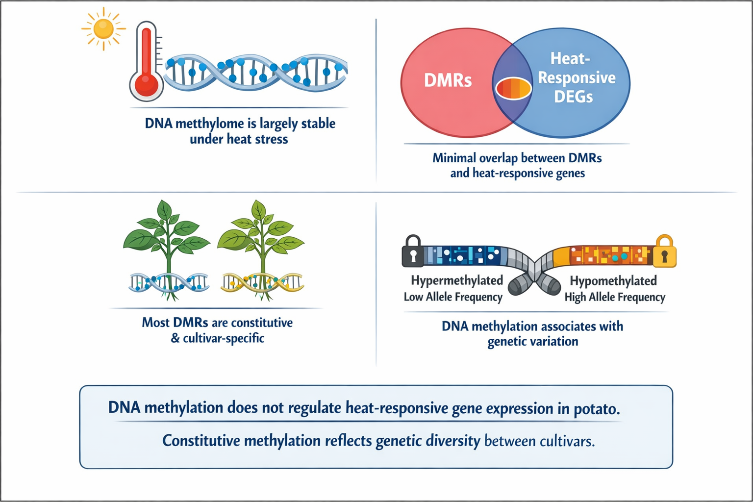 Die Ergebnisse zeigen, dass die meisten Unterschiede in der DNA-Methylierung unabhängig vom Hitzestress bestehen und hauptsächlich genetische Unterschiede zwischen den Sorten widerspiegeln. Zwar wurden viele Gene identifiziert, deren Aktivität sich unter Hitzestress verändert, doch nur wenige dieser Veränderungen standen in direktem Zusammenhang mit Änderungen der DNA-Methylierung. Insgesamt deutet die Studie darauf hin, dass die DNA-Methylierung bei Kartoffeln unter Hitzestress weitgehend stabil ist und eher zur genetischen Vielfalt beiträgt als direkt die Genexpression zu steuern.